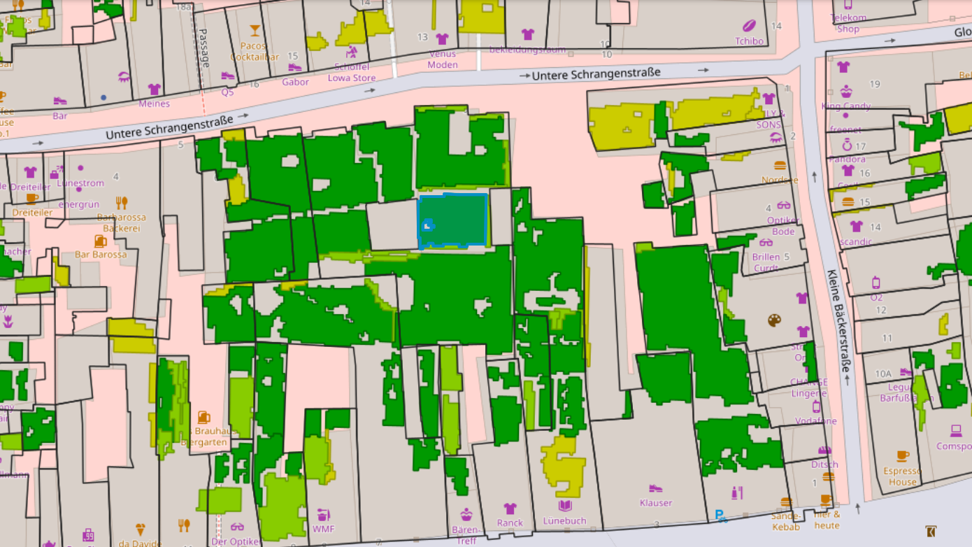 Die Gründachpotenzialanalyse zeigt, welche Dächer sich für eine Begrünung eignen – basierend auf Daten zu Dachform, Neigung, Verschattung und weiteren baulichen Gegebenheiten.