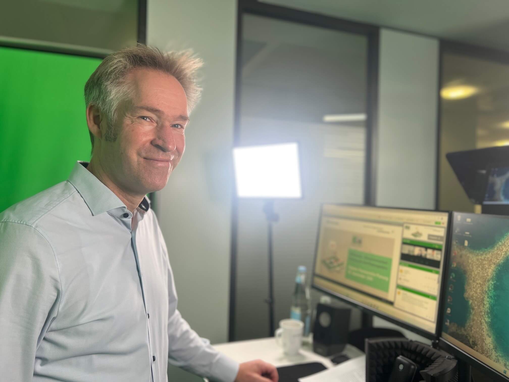 In unseren Büroräumen im Warmbüchenkamp in Hannover stehen für digitale Veranstaltungen zwei professionell ausgestattete „Greenrooms“ zur Verfügung. Auf dem Bild sehen Sie den Kollegen Jörg Erdmann in einem Greenroom kurz vor Veranstaltungsbeginn. Mithilfe unserer Eventplattform können wir dann die Inhalte für alle Teilnehmenden präsentieren und mit Ihnen chatten!