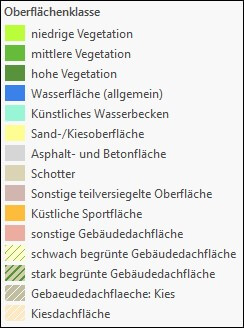 Schritt 1: Erstellen einer detaillierten Klassifizierung in bis zu 15 Oberflächenkategorien. Hierzu zählen unter anderem unterschiedliche Dachtypen – etwa begrünte Dächer, Kiesdächer oder Substratdächer – sowie die Unterscheidung zwischen natürlichen und künstlichen Sportflächen. Weitere Klassen umfassen Schotter, Sand und Kiese sowie harte Beläge wie Asphalt und Beton. Auch Vegetationsflächen werden differenziert nach niedriger, mittlerer oder hoher Vegetationsausprägung.