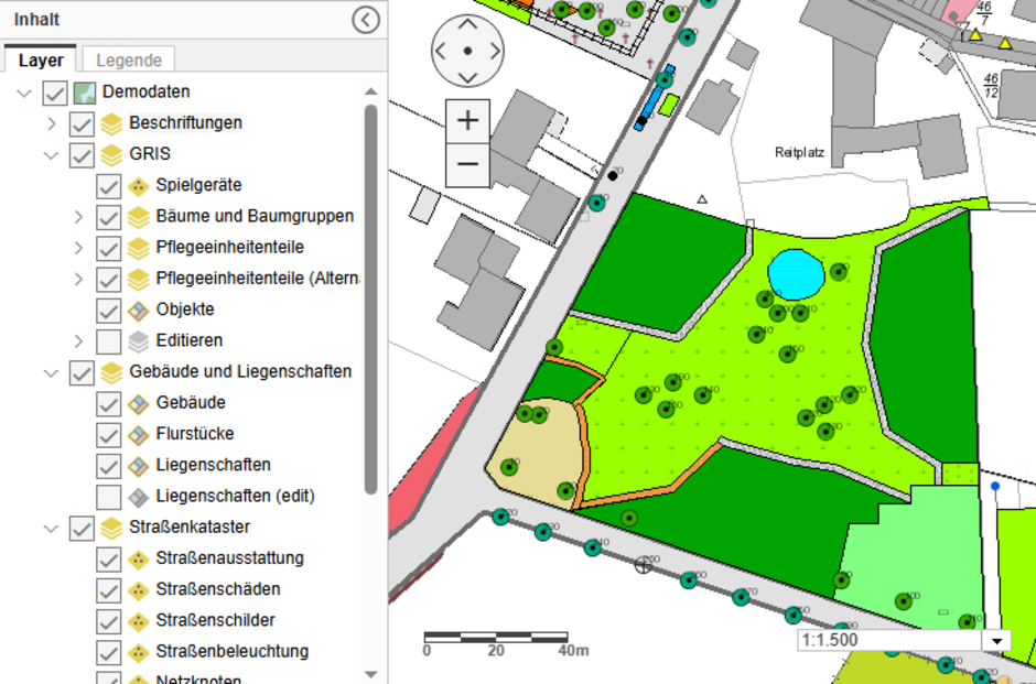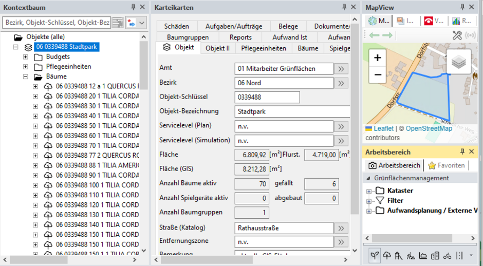 - Übergabe von Datenbankobjekten (Grünflächen, Bäume, Liegenschaften, Straßenteile, etc.) an die Grafik und umgekehrt